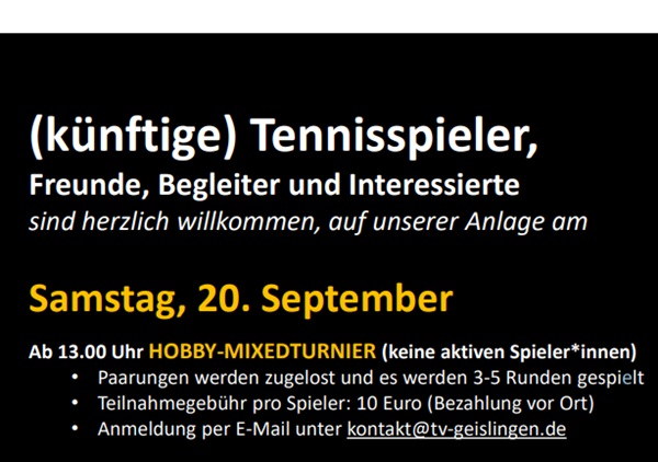 (künftige) Tennisspieler, Freunde, Begleiter und Interessierte sind herzlich willkommen, auf unserer Anlage am Samstag, 20. September ab 13.00 Uhr HOBBY-MIXEDTURNIER (keine...